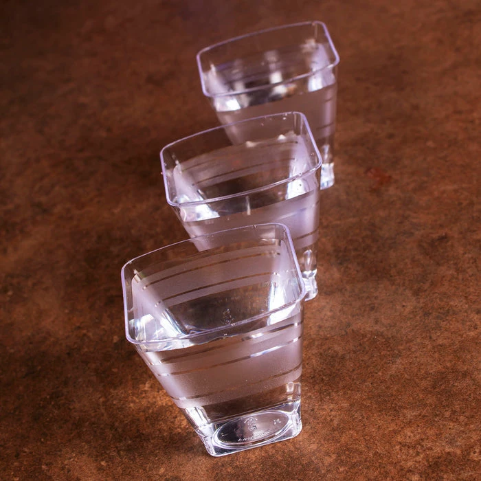 Get the party started with these square shot glasses. The clear plastic highlights the shots being served for any occasion. These cups are recyclable therefore reducing waste making these cups environmentally friendly. Due to their build they are easily stackable and provide an easy clean up. Each cup has a liquid capacity of 2 ounces and each pack comes with 18 cups.