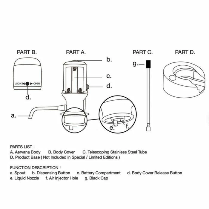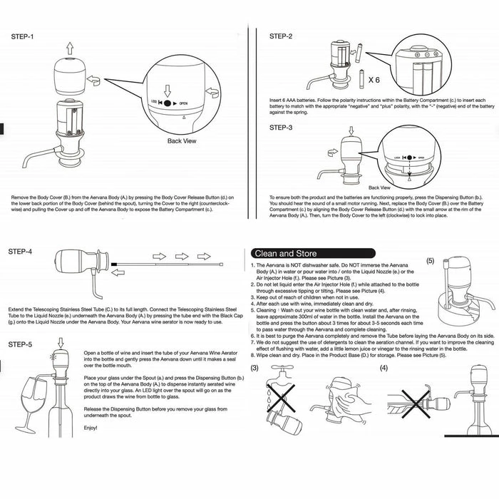 Let your wine breathe instantly with Aervana, the original bottle-top luxury wine aerator. The Original instantly aerates wine by infusing it with air under pressure as it’s being dispensed, ensuring that less favorable compounds like ethanol and sulfites evaporate away, leaving the delicious, flavorful elements of your wine to shine through. Simply press the button on top to dispense fully-aerated wine into your glass. Fast, easy to use and clean. Now with our stainless steel tube that telescopes to accommodate wine bottles from 750 ml to 1.5L and our countertop stand to elegantly store your Aervana. Product includes one stainless steel telescoping tube, the countertop storage stand and the Aervana body. Non-drip dispenser spout to table-top provides more than 10 inches clearance for the largest size wine glass. Stainless steel tube telescopes to accommodate both 750ml and 1.5 L wine bottles. Powered by 6 AAA 1.5V batteries (batteries not included). Aerate and dispense more than 250 bottles of wine (average bottle being 750 ml) per set of batteries.