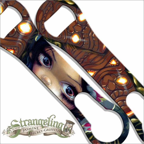 Artist’s description: Amara is one of the characters in my “Strangeling” book, and this design is created from my original acrylic illustration of her. A “menehune” – Hawaiian spirit – this piece has a decidedly tiki feel, bright colours, glowing tiki gods, flashing mysterious eyes, and an evocation of delicious tropical drinks…..