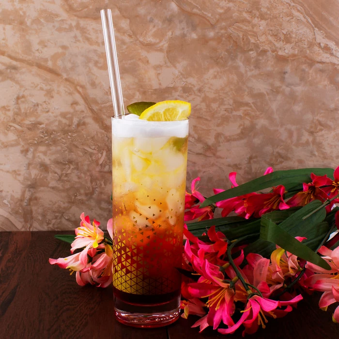 Inspired from a vintage vibe, this gold geometric pattern collins glass is certainly one to add to your unique glassware collection. Perfect for serving up your refreshing craft cocktails, this glass showcases a highly trending retro element. The subtle gold imprint is durable and scratch resistant, looking gorgeous while it illuminates around the liquids inside.