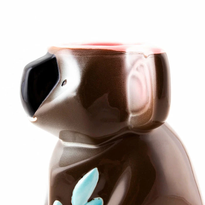 This adorable Koala tiki is just eager to find a new home in your bar. This product is made of durable ceramic and is hand painted and glazed to preserve its quality. This Koala is brown and features pink colored ears and light blue highlights. It is even holding a small number of eucalypt leaves. This tiki stands 6″ tall and has a rim diameter of 2″. Has a liquid capacity of 22 ounces.