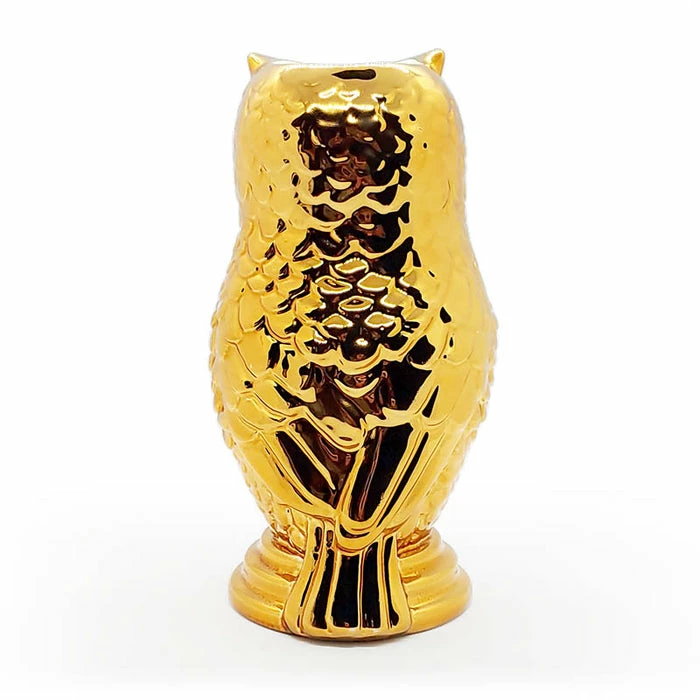 BarConic® gold ceramic great horned owl tiki mug. Made of high quality durable ceramic, hand painted and glazed with fine detail. Whether you’re crafting up delicious cocktails at home or at a tiki bar, guests will certainly love drinking from this elegant tiki mug. Measures 7 1/8″ H x 3 3/8″ W x 1 5/8″ Rim. Holds 24 oz.
