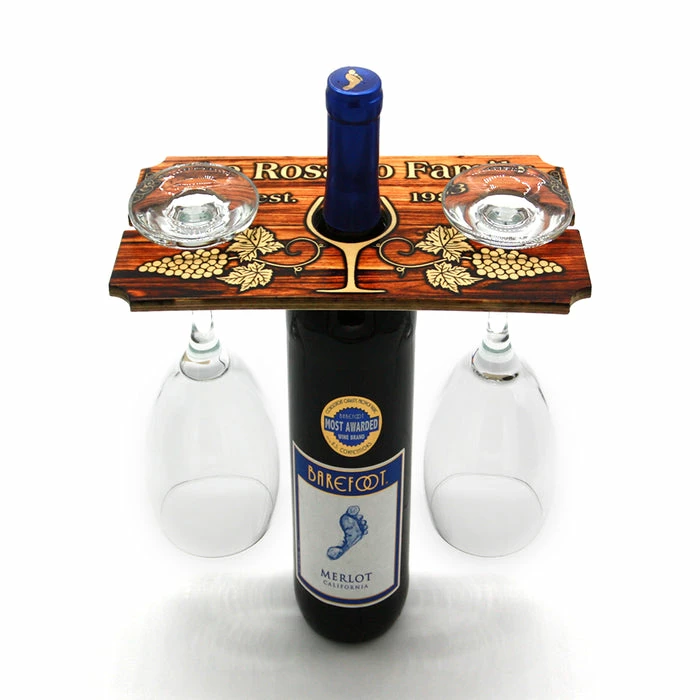 This beautifully rustic wooden Wine Glass Caddy is an exceptional addition to any type of bar or home setting! Our Wine Glass Caddy makes for a wonderful Housewarming gift, Custom Wedding gift, and a unique anniversary gift for the kitchen. The quality craftsmanship (handmade in our Woodshop USA) is beyond compare. This caddy allows you to carry 2 glasses of wine and a bottle of wine all in one hand. It also can be stacked with another caddy to hold 4 glasses! It also comes with 2 of our BARCONIC® 12 OZ WINE GLASSES!