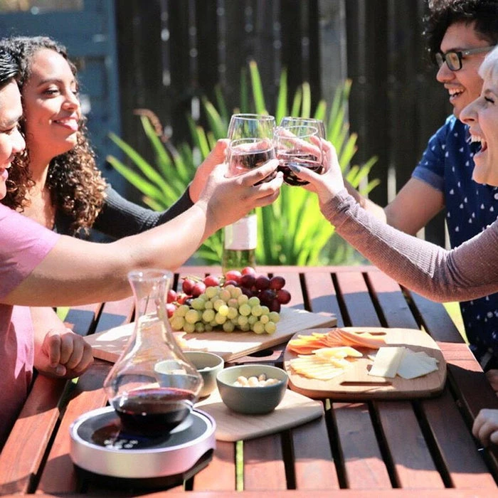 This is the next essential restaurant (or home) appliance! The Wake Up Wine Electronic Decanter Set with Bluetooth 3D Speakers. Enhance the aromas and improve the flavors of wine in a convenient, fast and fun way. Decant wine in just minutes, not hours, and make it taste 2-5 times better. Easy touch control panel you set or adjust decanting time with the push of a button. No need to guess how long you should decant your wine. Simply use the Recommended Decanting Times Guide for optimizing any wine by varietal as well as spirits such as whiskey, scotch, rum, tequila, cognac, brandy, vodka and gin. The 750 ML decanter is dishwasher safe and made of recycled glass. Itโs a great conversation piece making it a beautiful addition to any kitchen, bar or table. Regulate your pour using measuring marks at 4, 6, and 8 oz. Conveniently take this set everywhere from indoors to outdoors without having to connect to a power outlet. The battery is estimated to last up to 4 hours of continuous use from a full charge. The Bluetooth 3D speakers can stream music from any connected smartphone or tablet to set the tone of the party, or help you relax while enjoying your wine. Dual 2โ stereo speakers with dual passive radiators ensure crisp vocals, extended bass response, and 360ยฐ omni-directional sound.