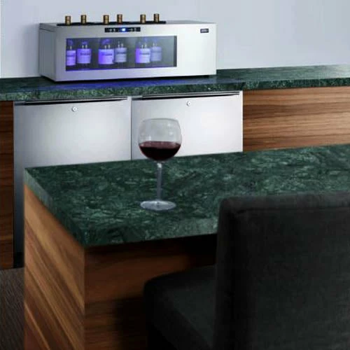 Six bottle countertop wine chiller with soft blue LED lighting adjust from three levels of brightness to best suit your setting. The compressor-based refrigeration cooling system ensures fast temperature pull-down ideal for use in bars, tasting rooms, and restaurants. Six slots let you store standard Burgundy style wine or champagne bottles in an upright position, with a tinted glass window that offers an attractive, illuminated display of the bottles’ labels. Digital controls for easy temperature management. Temperature can be set between 41 and 68ยบF. ETL-S listed to NSF-12 commercial standards for use in foodservice settings. Easy user maintenance with an auto defrosting system, with control panel setting included for defrosting if the cooler is used in areas of high heat or humidity. Ask for our freight quote. Measures: 12.5″ H x 35.75″ W x 15.38″ D